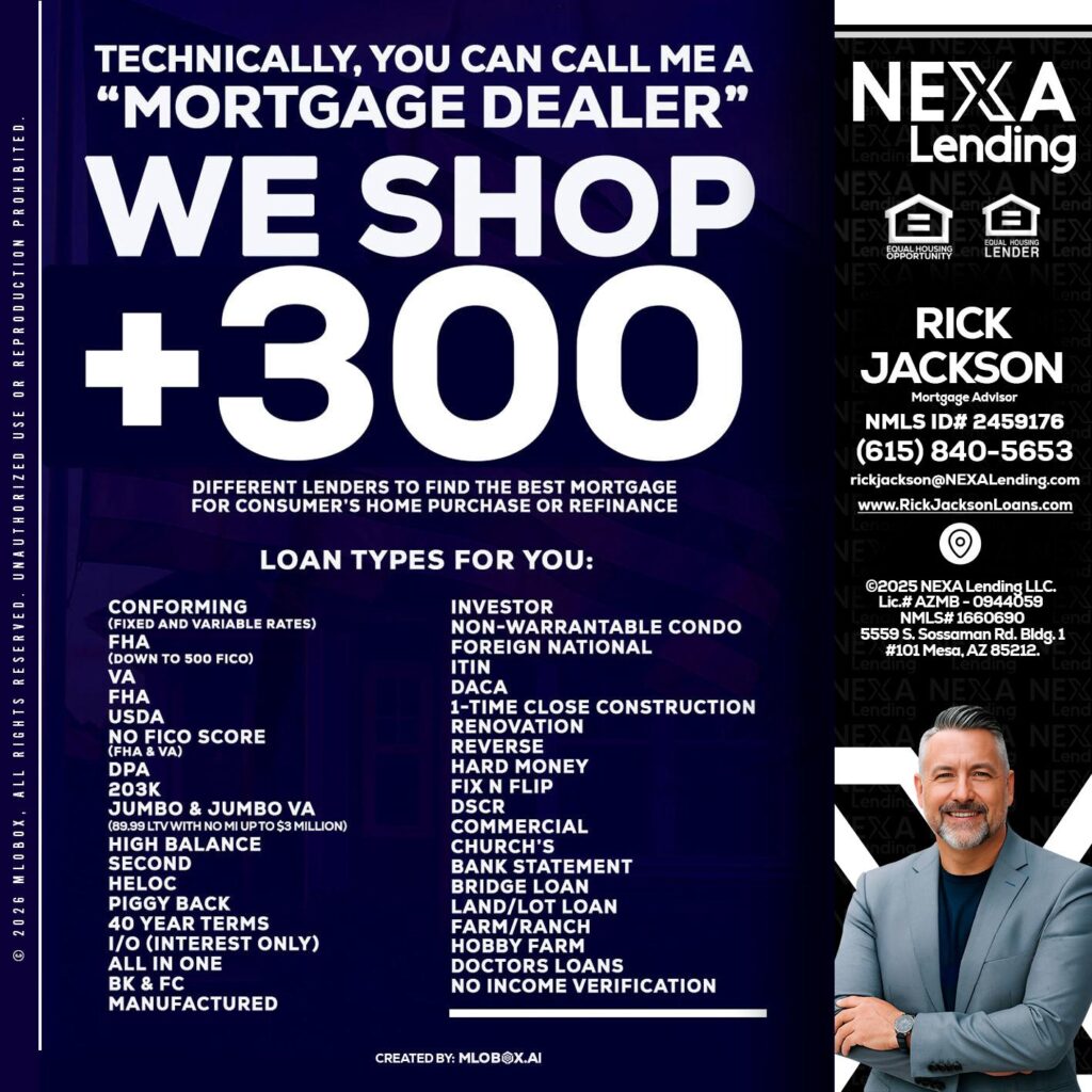 Hi, my name is Rick Jackson. I’m a Loan Officer with NEXA Lending LLC., offering personalized mortgage solutions, fast customized quotes, great rates and service with integrity.