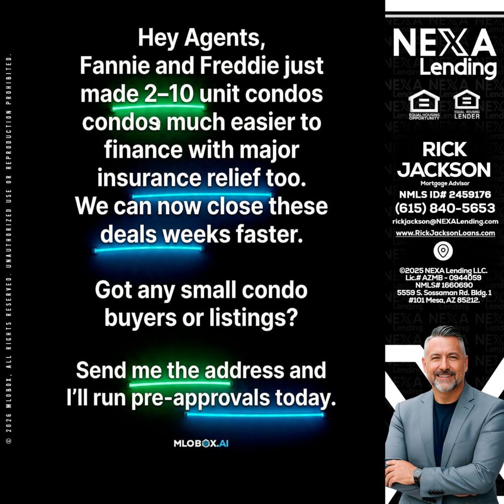 Hi, my name is Rick Jackson. I’m a Loan Officer with NEXA Lending LLC., offering personalized mortgage solutions, fast customized quotes, great rates and service with integrity.