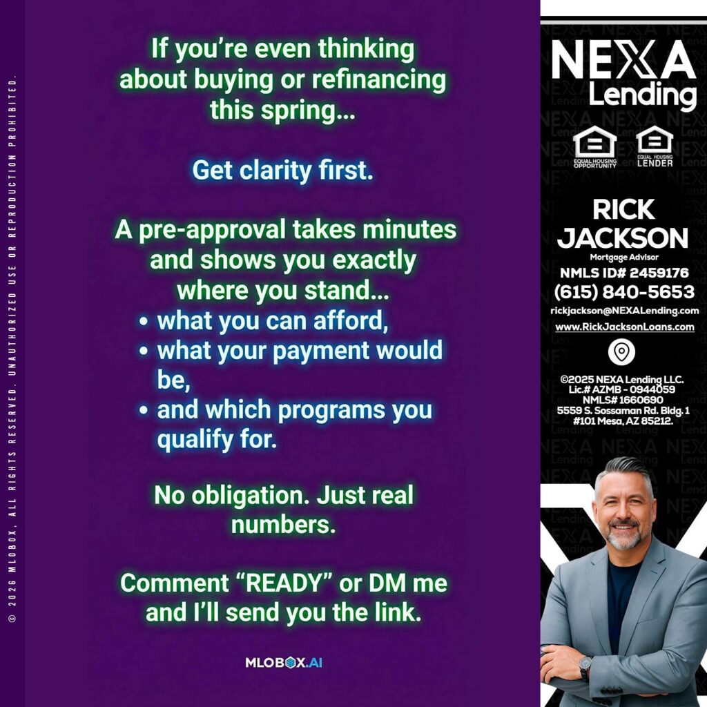 Hi, my name is Rick Jackson. I’m a Loan Officer with NEXA Lending LLC., offering personalized mortgage solutions, fast customized quotes, great rates and service with integrity.