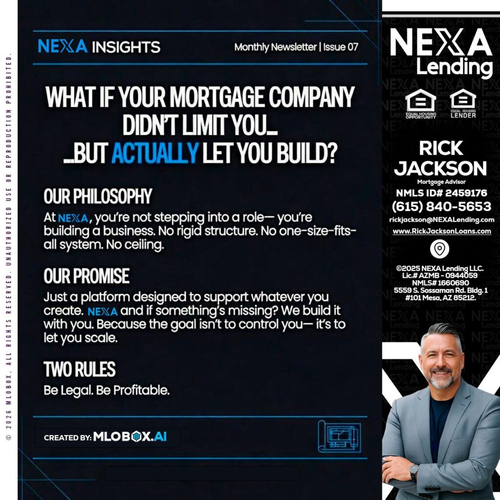 Hi, my name is Rick Jackson. I’m a Loan Officer with NEXA Lending LLC., offering personalized mortgage solutions, fast customized quotes, great rates and service with integrity.