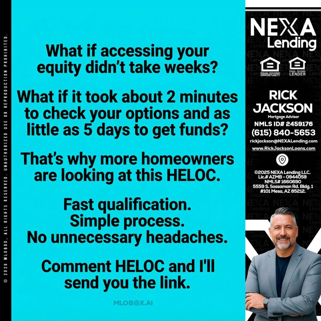 Hi, my name is Rick Jackson. I’m a Loan Officer with NEXA Lending LLC., offering personalized mortgage solutions, fast customized quotes, great rates and service with integrity.